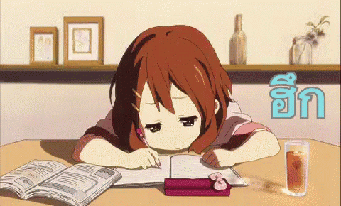 Yui Hirasawa from K-On! is visibly stressed and sad, diligently studying at a table with her books and a drink.