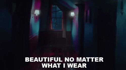 Tzuyu from Twice looking beautiful in a black dress, standing in a dark room with the caption 'Beautiful No Matter What I Wear'.
