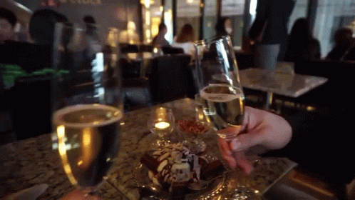 Two people toast with champagne and enjoy dessert in a cozy setting, featuring Yoonpic.