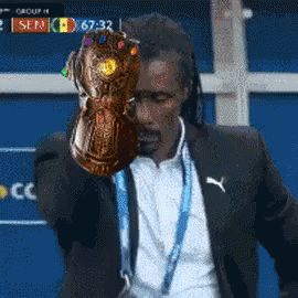 Senegal coach Aliou Cissé holds the Infinity Gauntlet during a World Cup match, ready to snap.