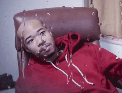Brian Jesse in a red hoodie, looking shocked and disappointed while lying in a chair with small objects on his face.