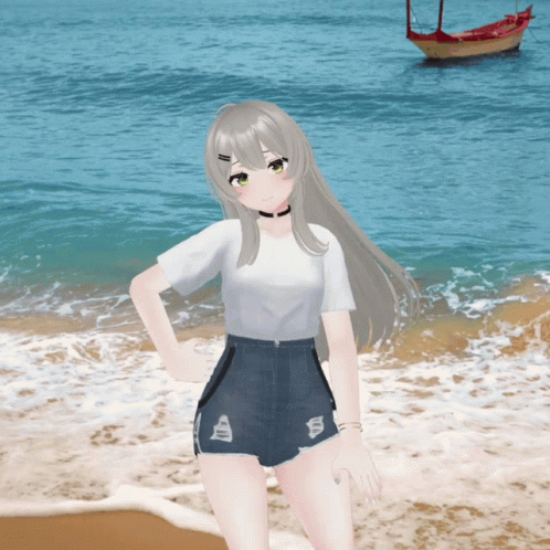 Virtual idol 비챤 (Viichan) enjoying a sunny day at the beach, posing in a white t-shirt and denim shorts.