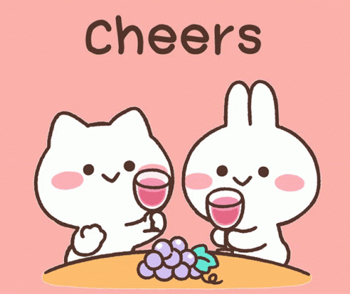 Mimi and Neko, a cute cat and rabbit, toast with wine glasses at a cheerful party.
