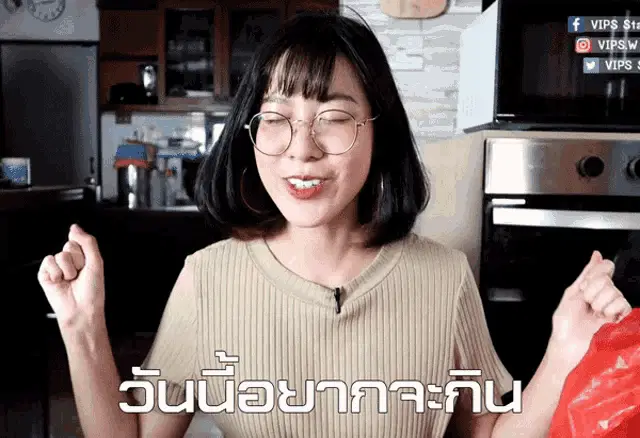 Woman with glasses making a funny face and expressing delight over delicious food.