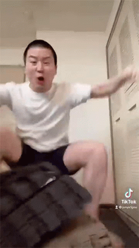 Junya, a man in a white shirt and shorts, dramatically jumps and screams in agony, making exaggerated expressions of pain.
