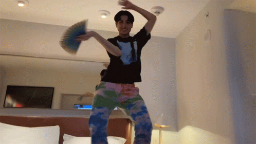 Kemio dancing energetically on a bed in a hotel room, wearing tie-dye pants and holding a blue object.