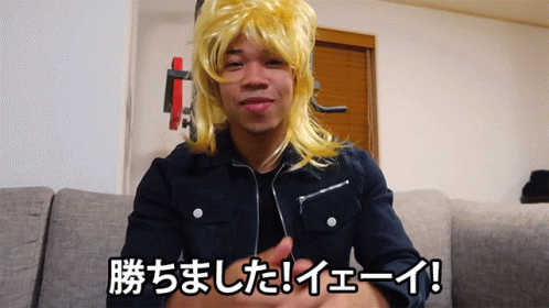 Brian Jesse, wearing a yellow wig, celebrates his victory with a triumphant pose and a big smile.