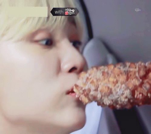 Seventeen's Seungkwan enjoying a delicious cheese hotdog, stretching the cheese with delight.