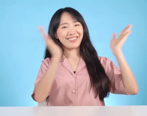 Softpomz, a young woman in pink, claps her hands enthusiastically with a big smile.