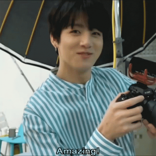 Jungkook from BTS smiles while holding a Sony camera, with 'Funny' caption.