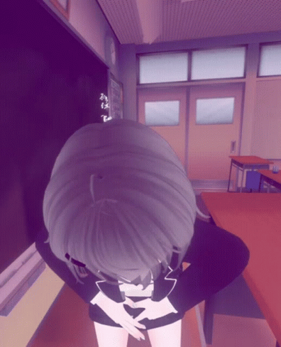 Viichan (ゔぃちゃん 비챤) in a school uniform, bowing apologetically in a classroom setting.