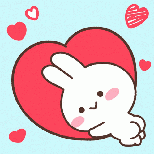 Mimi, a white bunny, snuggled in a big red heart, surrounded by smaller hearts, showing love.