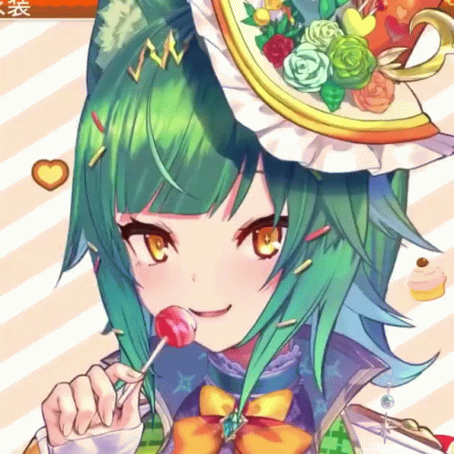 a girl with green hair is holding a lollipop in her mouth