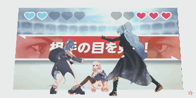 a pixel art of three anime characters with hearts around them and a sign that says ' hearts ' on it