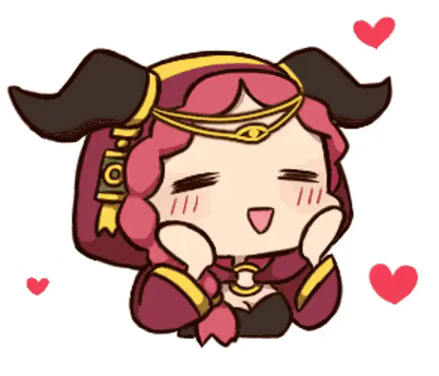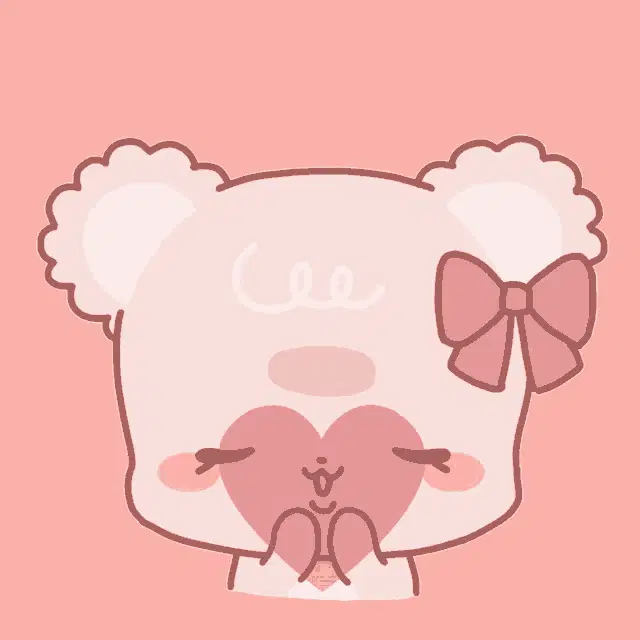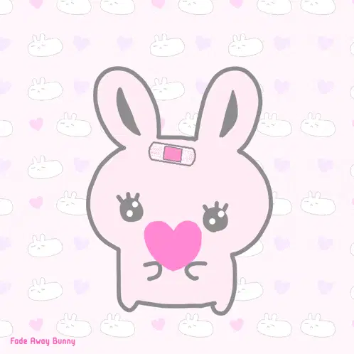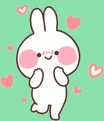 Mimi And Neko, a cute white rabbit with pink cheeks, blushes happily surrounded by floating hearts.