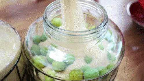 Pouring a thick layer of sugar over fresh green plums in a glass jar to prepare traditional Korean Maesil-cheong (plum syrup).