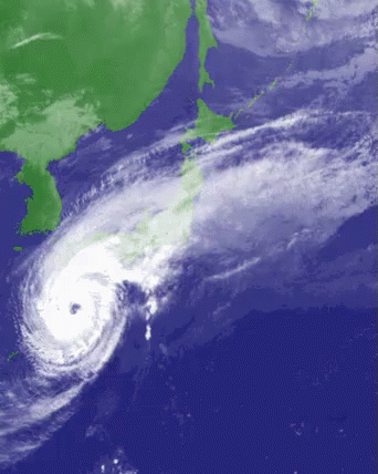 Satellite view of a powerful typhoon swirling in the ocean, approaching the coast of Japan.