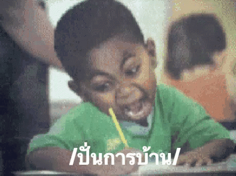A young boy intensely focused on writing his homework, possibly under pressure.