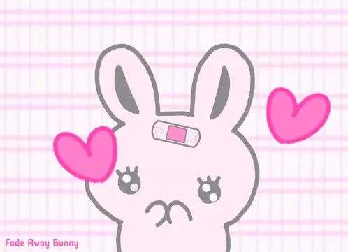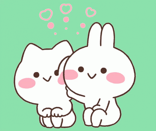 Mimi and Neko, the cute cat and rabbit, share a loving cuddle with hearts floating above them.