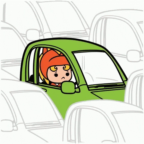 A cartoon girl in a green car looks annoyed while stuck in a crowded traffic jam, by artist Chow Hon Lam.