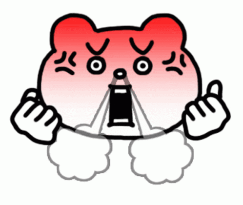 Betakkuma, the angry bear-like character, breathes out steam in a fit of rage, showing intense frustration.