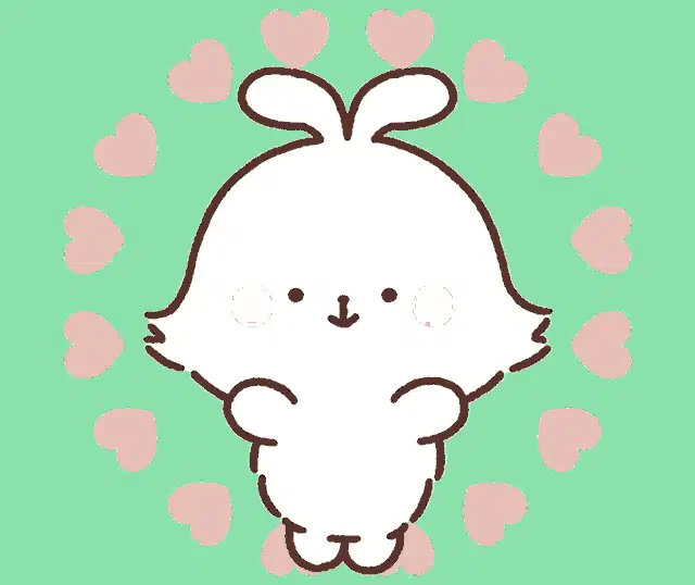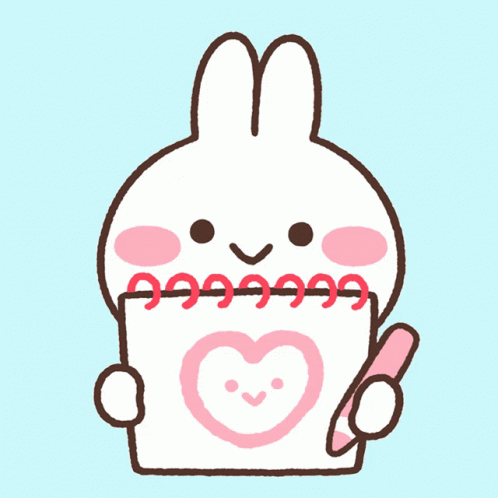 Cute cartoon rabbit Mimi draws a heart on a notepad with a pen.