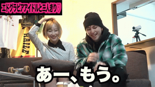 A man reacts with embarrassment, covering his face while sitting next to gravure idol Edo.