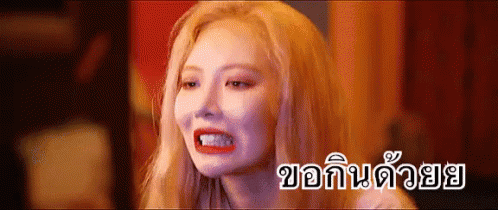 HyunA makes a funny face with blonde hair and red lips, expressing hunger with the caption 'Please let me eat too'.