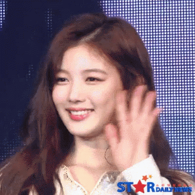 Korean actress Kim Yoojung smiles and waves her hand, greeting the audience at an event.