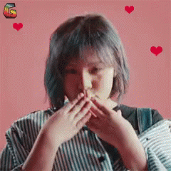 Xie Yi Lin (谢依霖) playfully covers her mouth with hands, surrounded by hearts and 'Kiss Kiss' text.