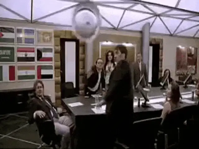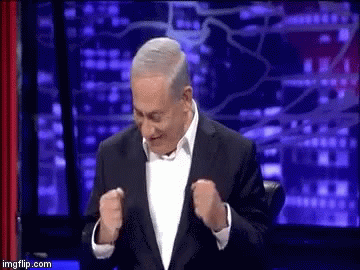 Benjamin Netanyahu smiling and laughing in a TV studio setting, making a funny gesture.
