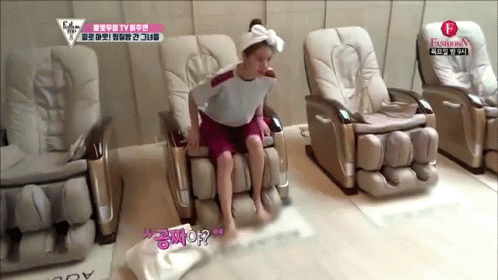 A woman experiences a massage chair at a jjimjilbang, asking if it's free and learning it costs three thousand won.