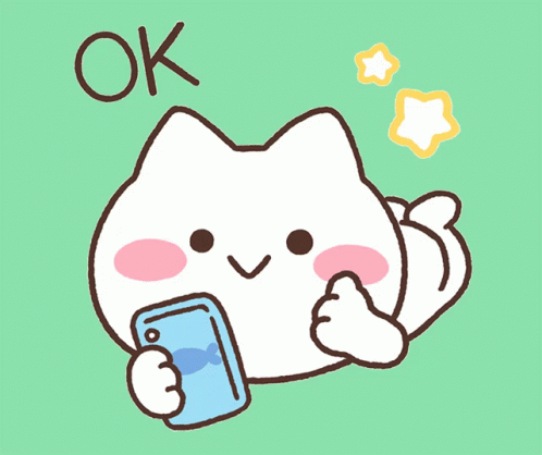 A cute cartoon cat winks and gives a thumbs up while holding a phone, with 'OK' and '了解' appearing.