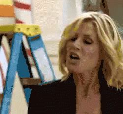 Blonde woman gestures with a pointed finger, expressing strong emotions like disdain or scolding.