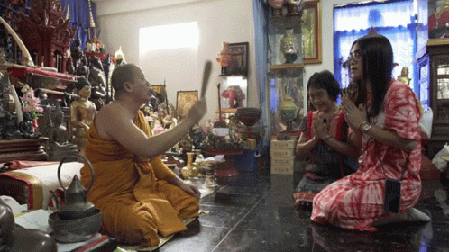 Gotji Touchakorn and another woman kneel before a monk, receiving blessings in a traditional ceremony.