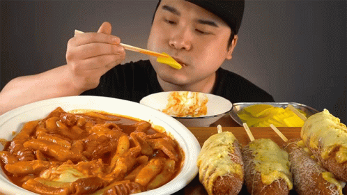 Ddeonggae enjoys a delicious mukbang featuring Myeongrang Hot Dogs, tteokbokki, and pickled radish.