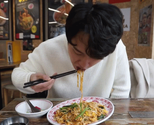 Yoonpic enjoys a delicious plate of noodles with chopsticks in a vibrant restaurant setting.