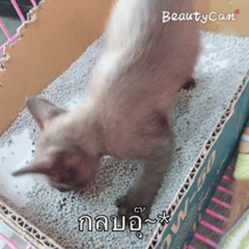A kitten named Brownie Bingsu covers its waste in a cardboard litter box with "BeautyCam" visible.