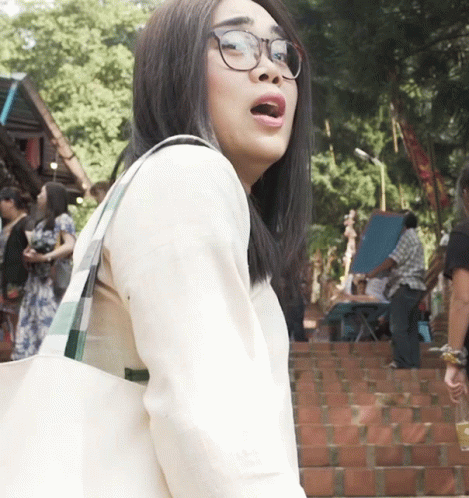 Mae Gotji pouting with glasses, wearing a white shirt and carrying a tote bag.