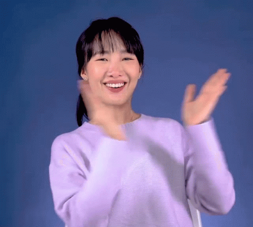 Softpomz smiling and clapping happily in a purple sweater, expressing joy and applause.