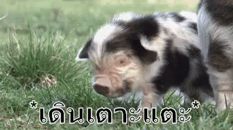A cute black and white spotted piglet toddles through green grass, exploring its surroundings.