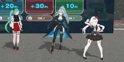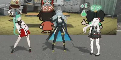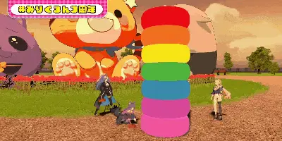 Cyber Girl Siro, Sister Claire, and Inaba Haneru react to a spinning number wheel in a courtyard.