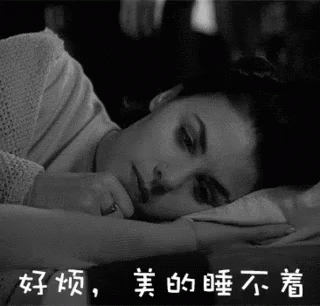 Woman frustrated and unable to sleep, lying in bed with a pensive expression, with Chinese text on screen.