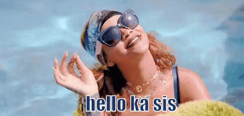 Rihanna in sunglasses and a bandana, smiling and waving while saying 'hello ka sis'.