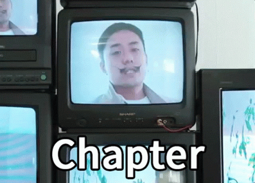 A man with a mustache appears on multiple stacked CRT monitors, with the word 'Chapter' overlaid.