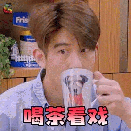 Xiu Jie Kai sips tea from a dog-themed mug, watching a show, embodying the phrase 'drinking tea and watching a show'.
