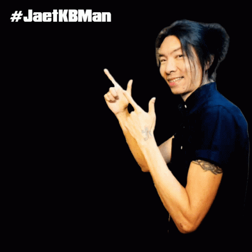 Jaet Jaet, also known as JaetKBMan, smiles and makes finger guns as Thai text 'คนนี้คิดถึง' (This person, I miss) appears.