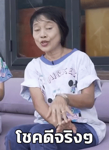 Mae Gotji (Touchakorn) smiles, wearing a Mickey Mouse shirt, feeling really lucky and happy.