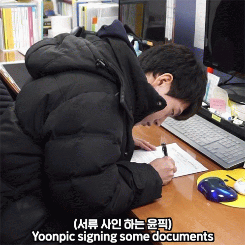 Yoonpic signs important documents at his desk, wearing a black puffer jacket in an office setting.