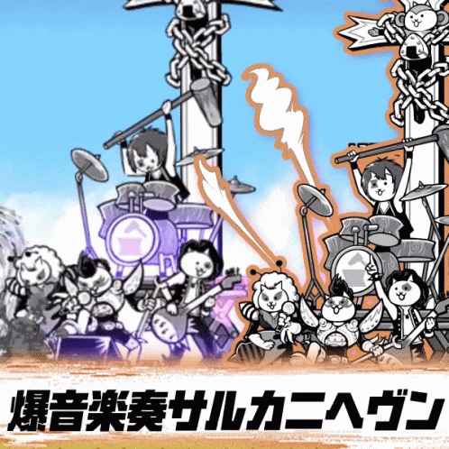 The Battle Cats characters perform a roaring music concert in Sarukani Heaven, featuring drums and guitars.